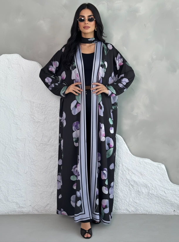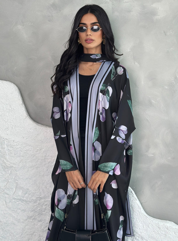 Half bisht Cut Black flora print Daily Abaya with Matching Headscarf.
