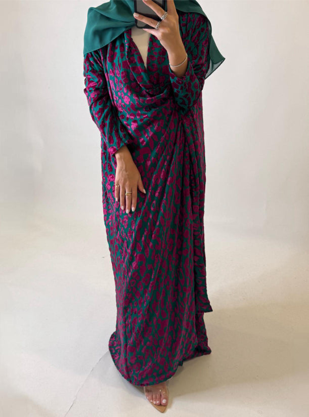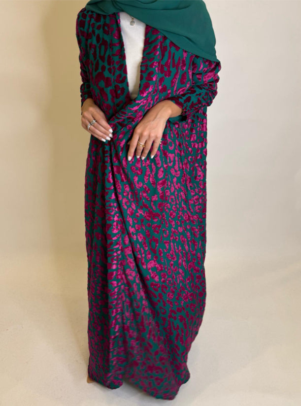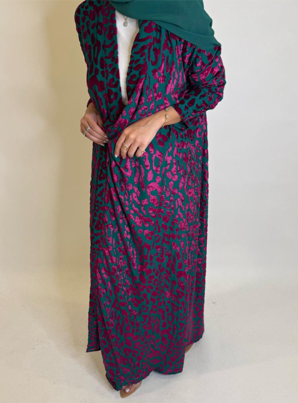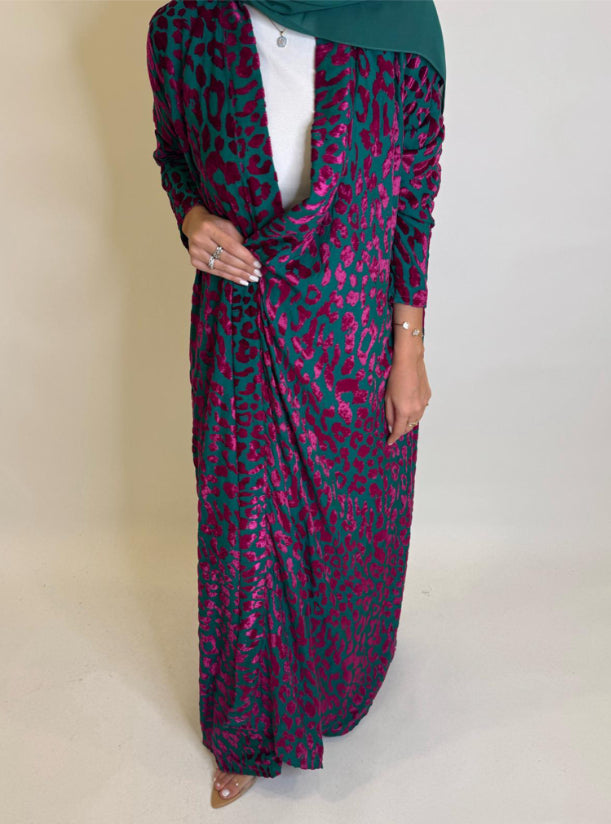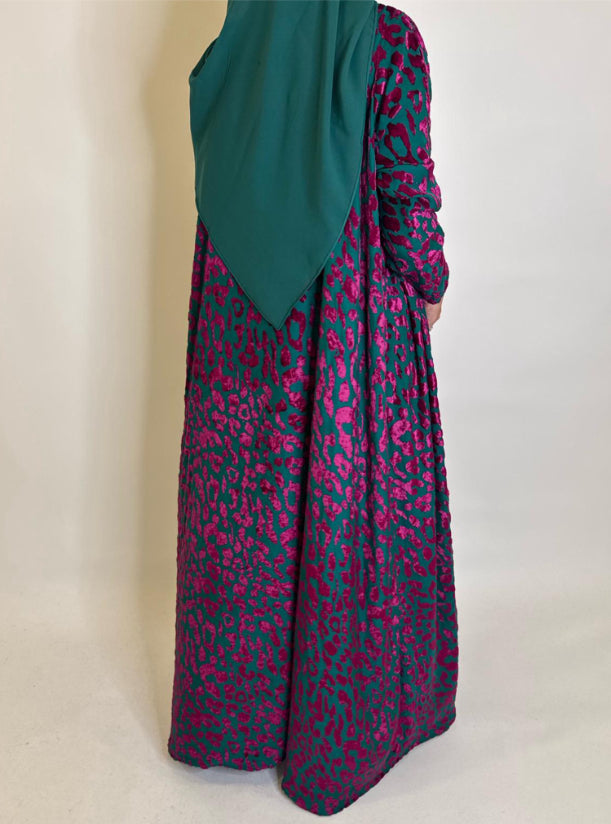 Green & Pink Winter Velvet Leopard Pattern A-Cut Wrap Abaya with Matching Head Scarf.