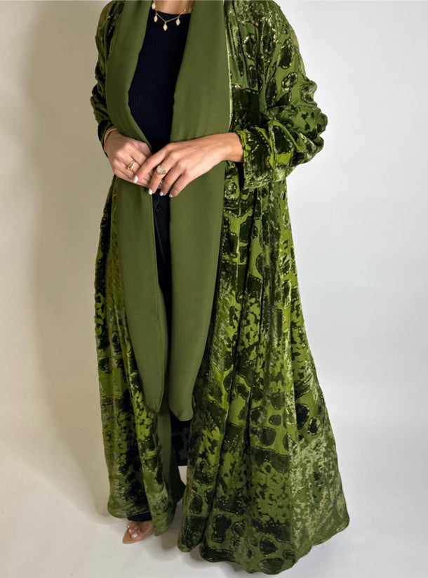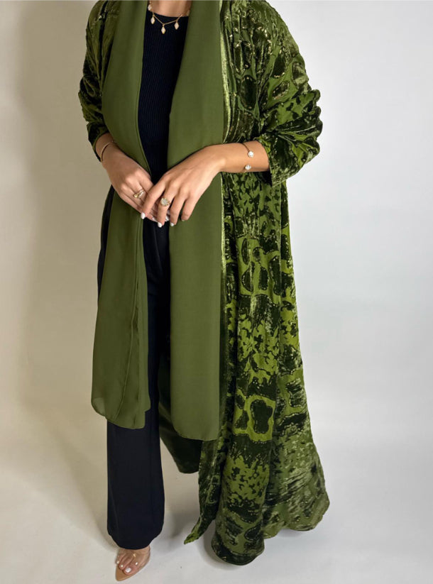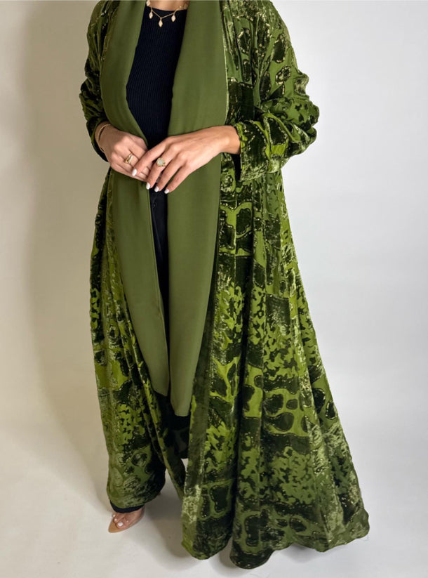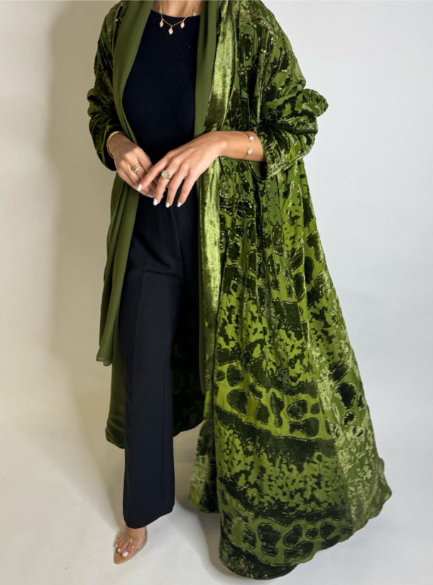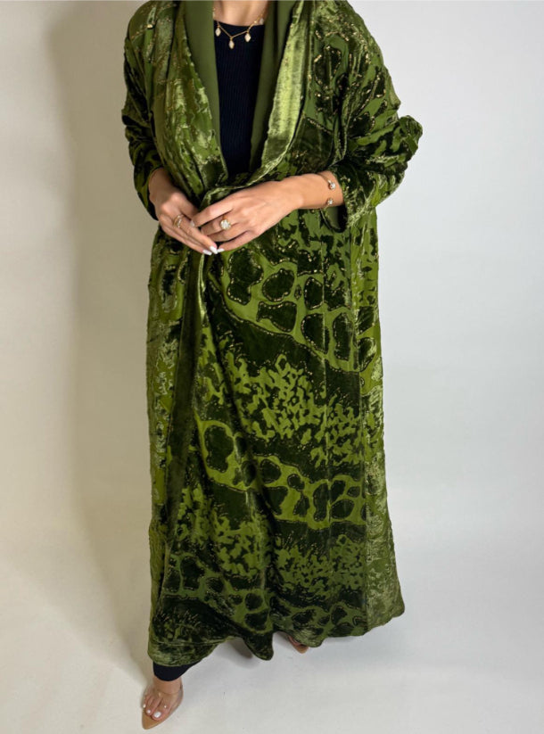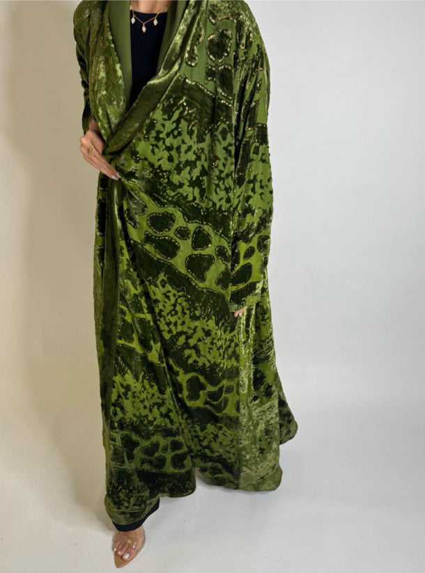 Green/ Gold Velvet & Chiffon Pattern A-Cut Wide Wrap Abaya with Matching Head Scarf